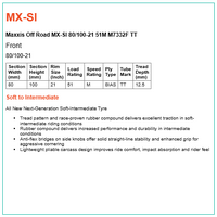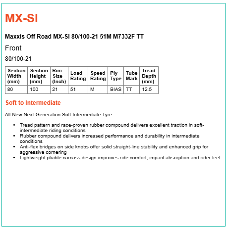 • Tread pattern and race-proven rubber compound delivers excellent traction in soft-intermediate riding conditions