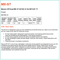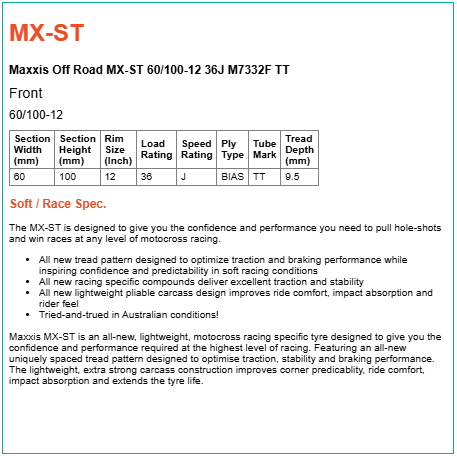 Maxxis MX-ST is an all-new, lightweight, motocross racing specific tyre designed to give you the confidence and performance required at the highest level of racing. Featuring an all-new uniquely spaced tread pattern designed to optimise traction, stability and braking performance. The lightweight, extra strong carcass construction improves corner predicablity, ride comfort, impact absorption and extends the tyre life.