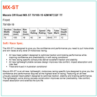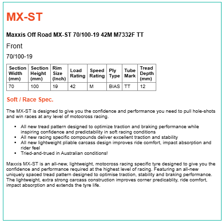 Maxxis MX-ST is an all-new, lightweight, motocross racing specific tyre designed to give you the confidence and performance required at the highest level of racing. Featuring an all-new uniquely spaced tread pattern designed to optimise traction, stability and braking performance. The lightweight, extra strong carcass construction improves corner predicablity, ride comfort, impact absorption and extends the tyre life.