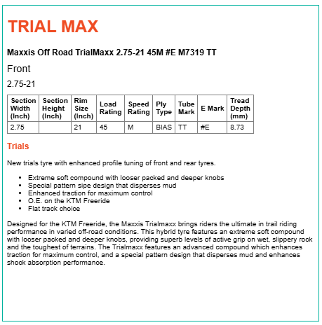 Designed for the KTM Freeride, the Maxxis Trialmaxx brings riders the ultimate in trail riding performance in varied off-road conditions. This hybrid tyre features an extreme soft compound with looser packed and deeper knobs, providing superb levels of active grip on wet, slippery rock and the toughest of terrains. The Trialmaxx features an advanced compound which enhances traction for maximum control, and a special pattern design that disperses mud and enhances shock absorption performance.
