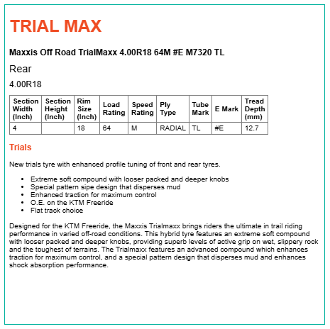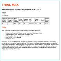 Designed for the KTM Freeride, the Maxxis Trialmaxx brings riders the ultimate in trail riding performance in varied off-road conditions. This hybrid tyre features an extreme soft compound with looser packed and deeper knobs, providing superb levels of active grip on wet, slippery rock and the toughest of terrains. The Trialmaxx features an advanced compound which enhances traction for maximum control, and a special pattern design that disperses mud and enhances shock absorption performance.
