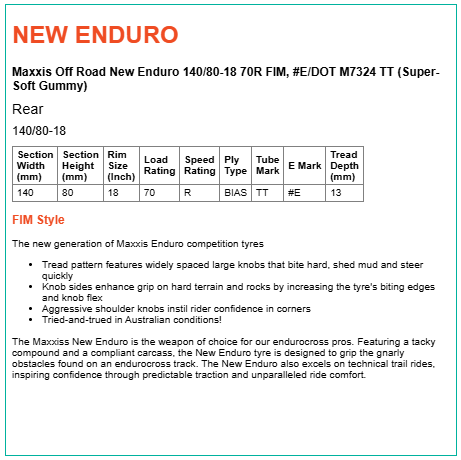 Maxxis Off Road New Enduro 140/80-18 70R FIM, #E/DOT M7324 TT (Super-Soft Gummy)