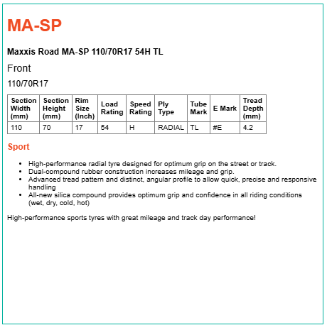 • Advanced tread pattern and distinct, angular profile to allow quick, precise and responsive handling
