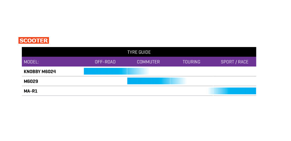 The M6024 is built for the scooter rider looking for a comfortable, versatile tyre for both on-road and off-road use. The M6024 features a knobby tread pattern for optimal traction when riding in off-road terrain and also features a durable compound, perfect for long-lasting, comfortable street riding. Upgrade your scooter today with the M6024 scooter tyre from Maxxis!