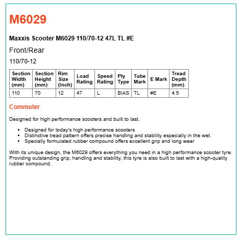 With its unique design, the M6029 offers everything you need in a high performance scooter tyre. Providing outstanding grip, handling and stability, this tyre is also built to last with a high-quality rubber compound.