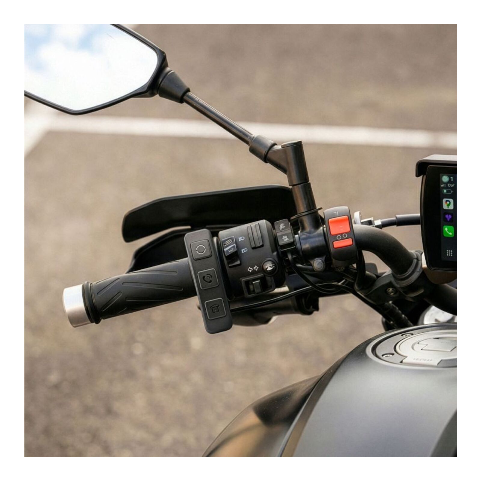 Positioned next to the handlebar grip, it allows you to control the main functions of the device without ever taking your hands off the handlebars. It is used in combination with the Bikeplay Pro Expansion Kit (code 1683 – with 2 cameras, cable and 2 TPMS sensors) or with the Bikeplay Pro multipolar cable (code C1691), For a complete and even more intuitive management of the phone and connected cameras.
