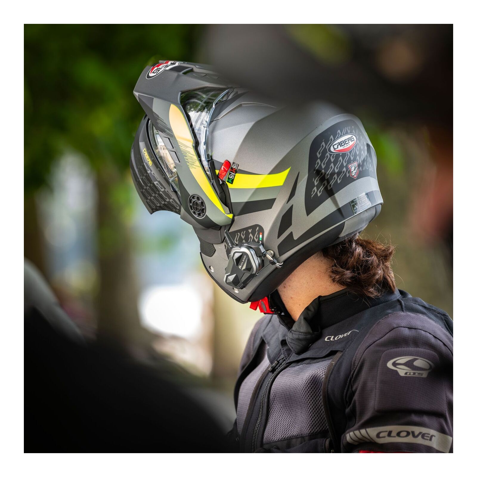 - 2 microphone options (flexible wired mic for full helmets, boom mic for open helmets).