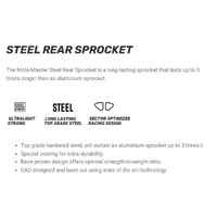 The Moto-Master Ultralight Steel Rear sprockets are made to the highest standard when it comes to materials, state of the art manufacturing processes and technology. Made of specially-hardened steel that is nickel-plated, it will outlast an aluminium sprocket up to 3 times longer.