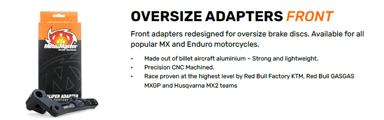 Front adapters redesigned for oversize brake discs. Available for all popular MX and Enduro motorcycles.