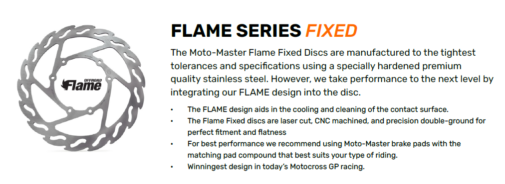 - Moto-Master Flame Discs are manufactured to the tightest tolerances and specifications using a specially hardened premium quality stainless steel