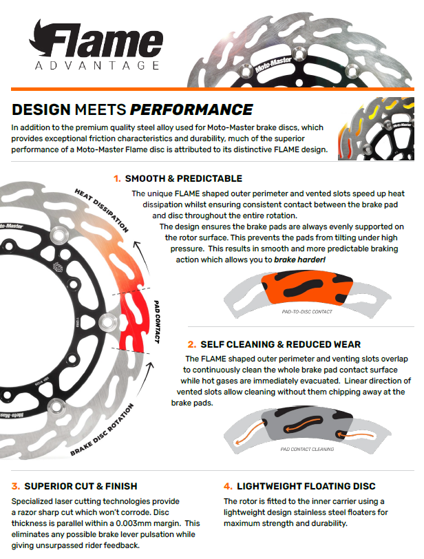 - Their unique flame design ensures an equal amount of contact between brake pad and disc throughout the whole disc rotation.