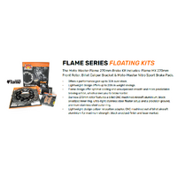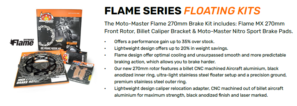 The Moto-Master Flame 270mm Brake Kit includes: Flame MX 270mm Front Rotor, Billet Caliper Bracket & Moto-Master Nitro Sport Brake Pads.