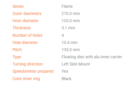 The Moto-Master 270mm oversize Flame rotors are the perfect solution for MX riders looking for more stopping power. Full-floating and cut with the innovative Flame design, they offer a performance gain up to 35% over stock, along with up to 20% in weight savings. The new 270mm rotor features a billet CNC machined Aircraft aluminium, black anodized inner ring, ultra-light stainless steel floater setup and a precision  grinded, premium stainless steel outer ring.