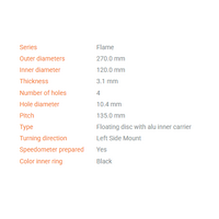 The Moto-Master 270mm oversize Flame rotors are the perfect solution for MX riders looking for more stopping power. Full-floating and cut with the innovative Flame design, they offer a performance gain up to 35% over stock, along with up to 20% in weight savings. The new 270mm rotor features a billet CNC machined Aircraft aluminium, black anodized inner ring, ultra-light stainless steel floater setup and a precision  grinded, premium stainless steel outer ring.