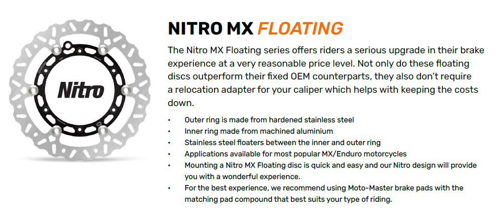 Moto-Master Nitro Discs offer innovative design and performance enhancement according to Moto-Master quality standards. Made from specially hardened premium quality stainless steel.