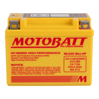 Motobatt Pro Lithium batteries are around 3x lighter than conventional lead- acid batteries yet they produce even greater cranking performance ideal in competitive environments. This additional power translates into the ability to provide strong starting currents that are required for reliable repeated starts at a wider range of temperatures than lead-acid batteries. Due to their very low idle discharge Motobatt Pro Lithium batteries can retain charge after more than a year of inactivity. Pro Lithium batteries have a high life expectancy with over 2000 cycles compared to around 500 for a lead-acid battery while also boasting a short recharge time supplying up to 90% charge after.
