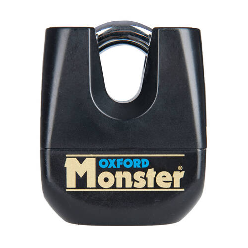 The Oxford Monster Ultra strong padlock has a hardened boron steelarmour casing 11mm hardened steel shackle and comes with three keys.