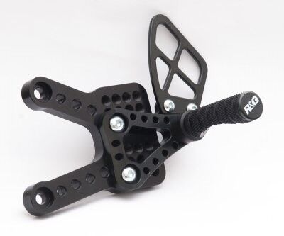 Designed to be easily installed. Powdercoated in black with crisp white R&G graphics on the peg and levers, giving these rearsets a very sharp look. The footrests are specially textured to ensure maximum grip in even the most tricky situations.