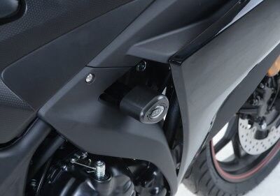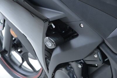 These crash protectors feature our stylish, aerodynamic Aero Bobbins and are available in black. Suitable for the Yamaha R25 '14-'18 and the R3 '15-'18- models. These crash protectors are the low profile race version. These are designed to protect the frame, and therefore fairing protection is minimal. Suited to racing use only. R&G Aero Bobbins are a stylish, aerodynamic, teardrop shaped bobbin improving on the original good looks of our highly successful and popular standard round bobbins. Fitted with a removable end cap which hides the bobbins fittings, this sleek design looks superb and is a winner on road and track!