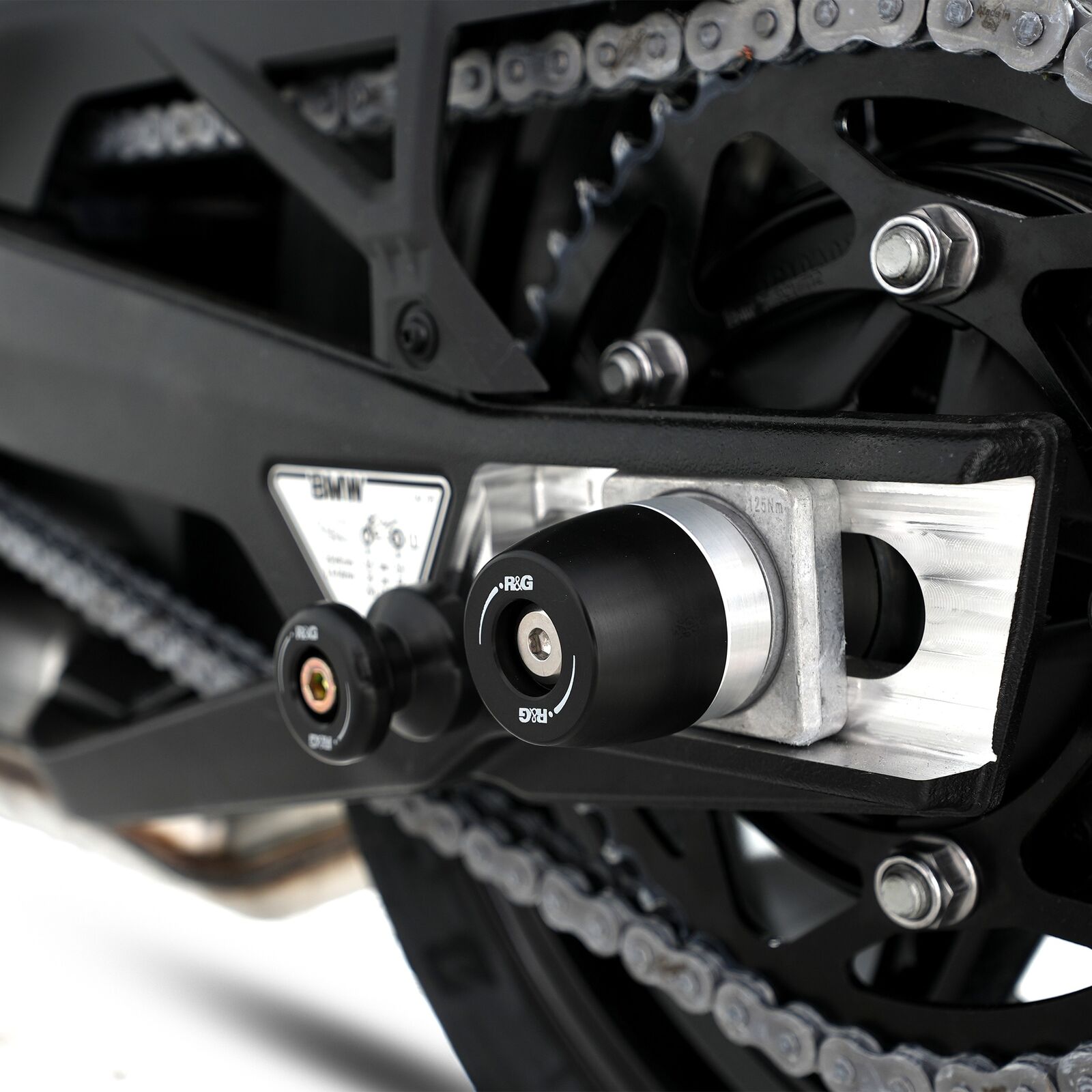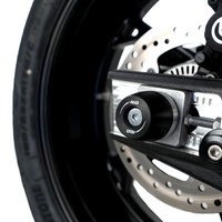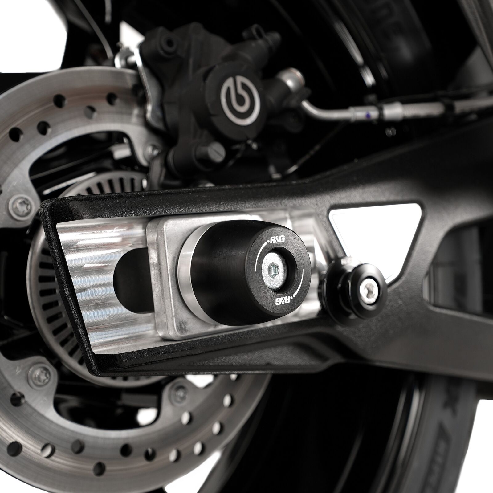 The R&G swingarm protectors provide protection for vulnerable rear end components in the event of a crash, drop or slide. Replaceable High-Density Polyethylene (HDPE) new tapered-style bobbins are used for superior impact and abrasion protection that helps slow the motorcycle to a smooth, controlled stop. This essential protector will keep valuable components off the ground to prevent some seriously expensive repairs after a fall. Installation is simple with no permanent modification to the bike needed.