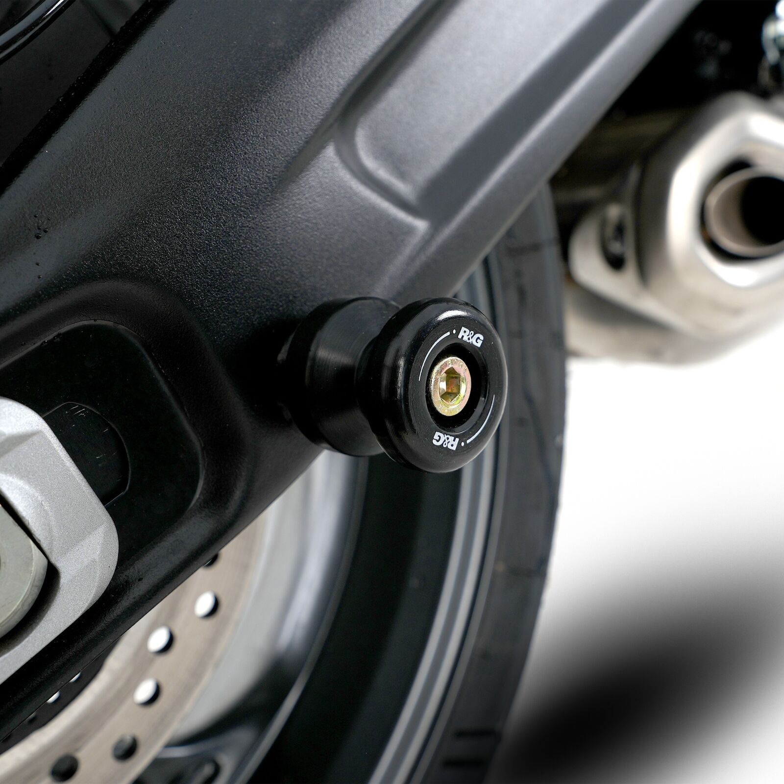 R&G Cotton Reels locate on the paddock stand mounting points on the rear swingarm, offering protection and functionality in one product. Protecting the swingarm and drive components - keeping them off the ground in case of a crash or drop, as well as working as paddock standpoints for lifting the rear of the bike onto a paddock stand for tyre removal, chain adjusting/lubrication and bike cleaning!