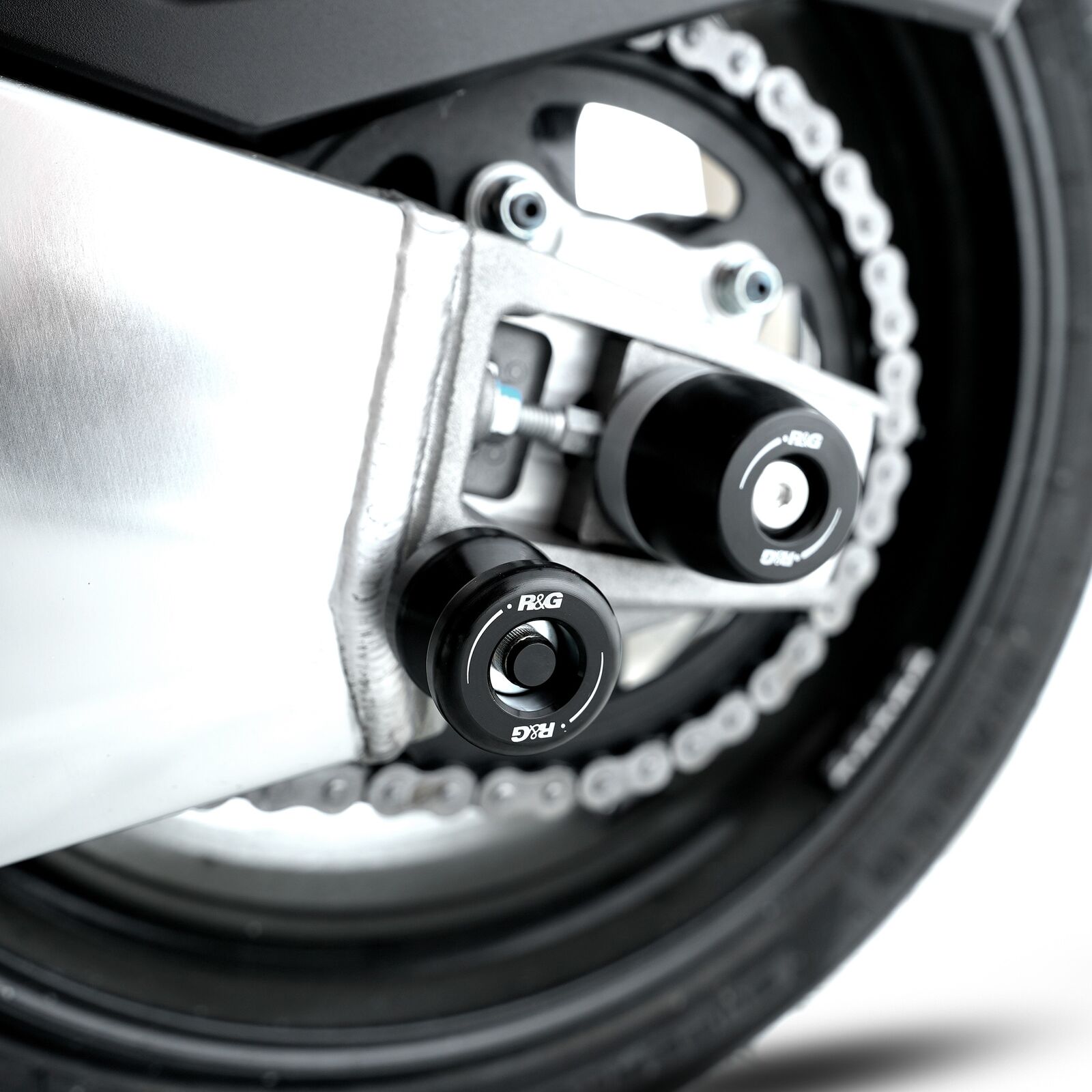 R&G Cotton Reels mount directly into Swingarm. The product gives protection to the swingarm, rear disc and chain areas. Aswell as allowing the bike to be lifted on a paddock stand to perform maintenance and cleaning.