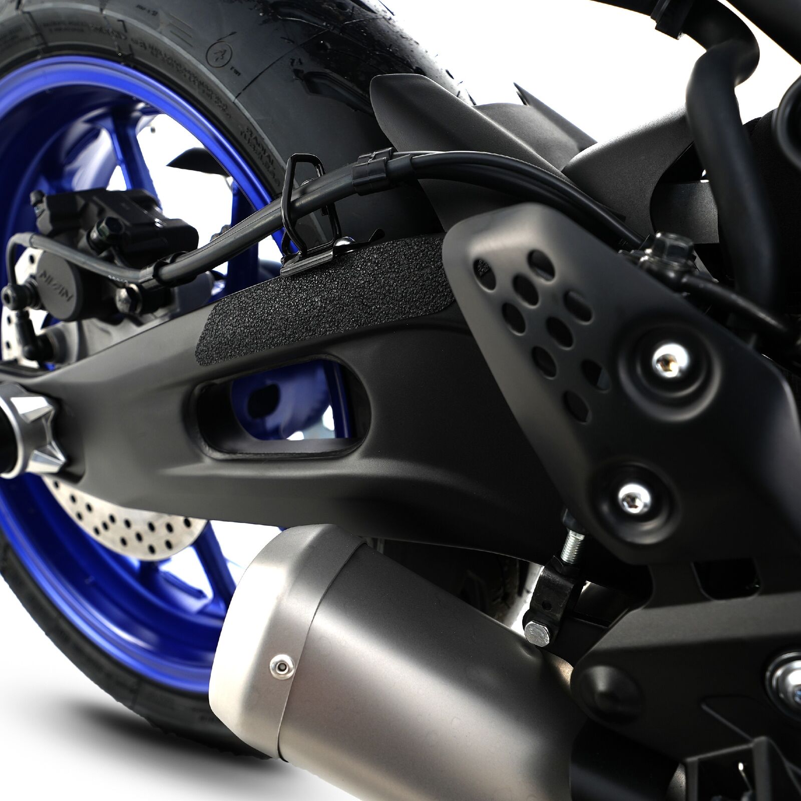 R&G Boot Guard kits are available for a large range of bike styles and brands, with new applications released regularly. The unique R&G texture was specifically designed to be durable, providing the rider with a buffer between his boot on the exposed areas of the swingarm which can (on occasion) come into contact with each other during cornering causing wear and unwanted damage to the swingarm or boots (both expensive to fix!). Each Boot Guard kit is supplied with precision pre-cut adhesive pieces, designed to fit the intended bike, typically in either 2 or 4 pieces depending on the shape of the swingarm. The high-strength adhesive backing ensures a highly durable product that will stay exactly where you put it, as well as not affecting or damaging paintwork. Please note: R&G Boot Guards now come with a 25mm diameter stick-on emblem. This Boot Guard kit has been specially designed for the Yamaha MT-07 '14- '24 (FZ-07), Yamaha XSR700 '16- & Yamaha R7 '22- models. Made in the UK.