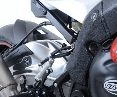 R&G Boot Guard kits are available for a large range of bike styles and brands, with new applications released regularly. The unique R&G texture was specifically designed to be durable, providing the rider with a buffer between his boot on the exposed areas of the swingarm which can (on occasion) come into contact with each other during cornering causing wear and unwanted damage to the swingarm or boots (both expensive to fix!). Each Boot Guard kit is supplied with precision pre-cut adhesive pieces, designed to fit the intended bike, typically in either 2 or 4 pieces depending on the shape of the swingarm. The high-strength adhesive backing ensures a highly durable product that will stay exactly where you put it, as well as not affecting or damaging paintwork. This 4pcs R&G Boot Guard kit has been specially designed for the BMW S1000RR '15- and the S1000R '17-'20, protecting the swingarm and lower frame from unwanted scuffs and marks from boot wear and rubbing. Please note: R&G Boot Guards now come with a 25mm diameter stick-on emblem. Made in the UK.