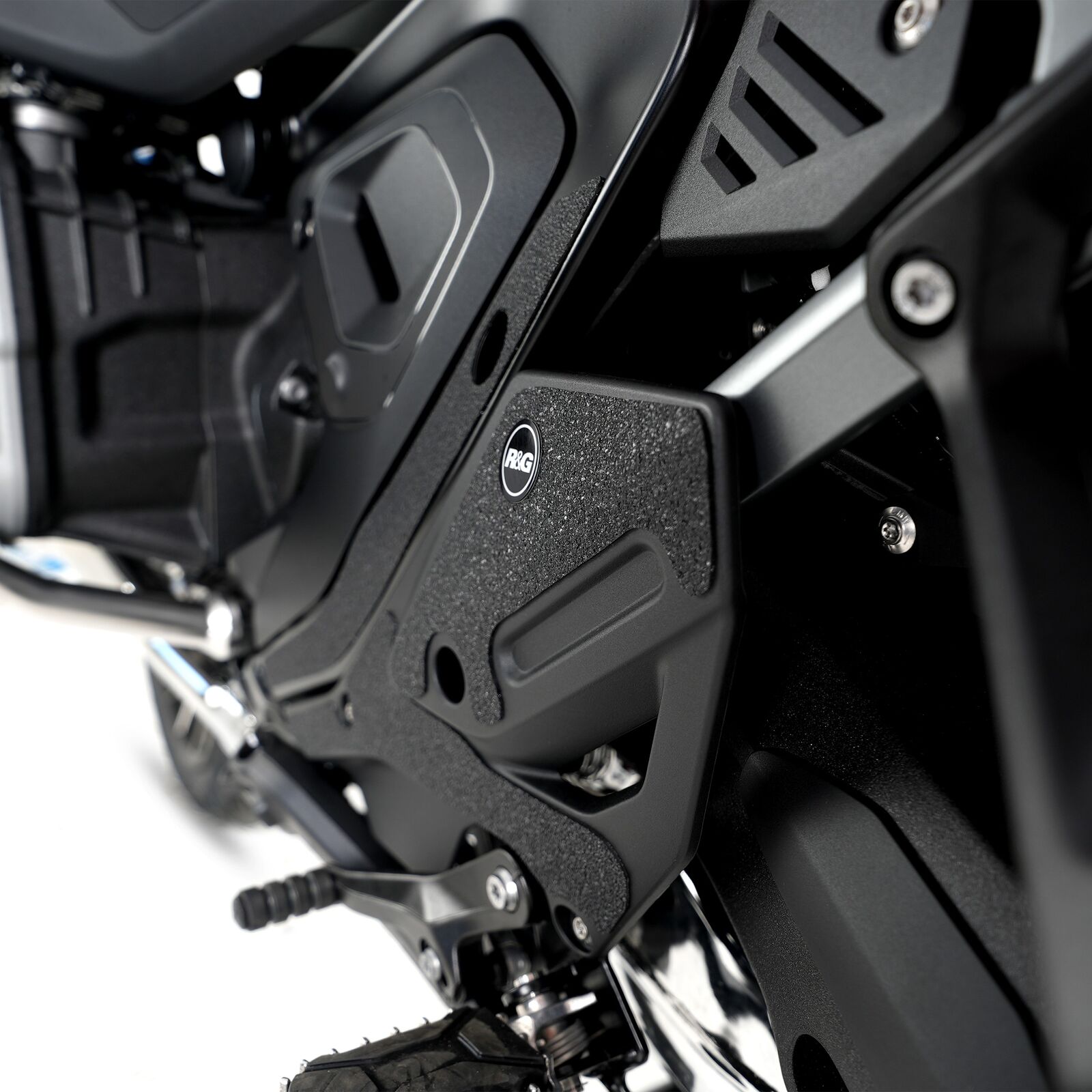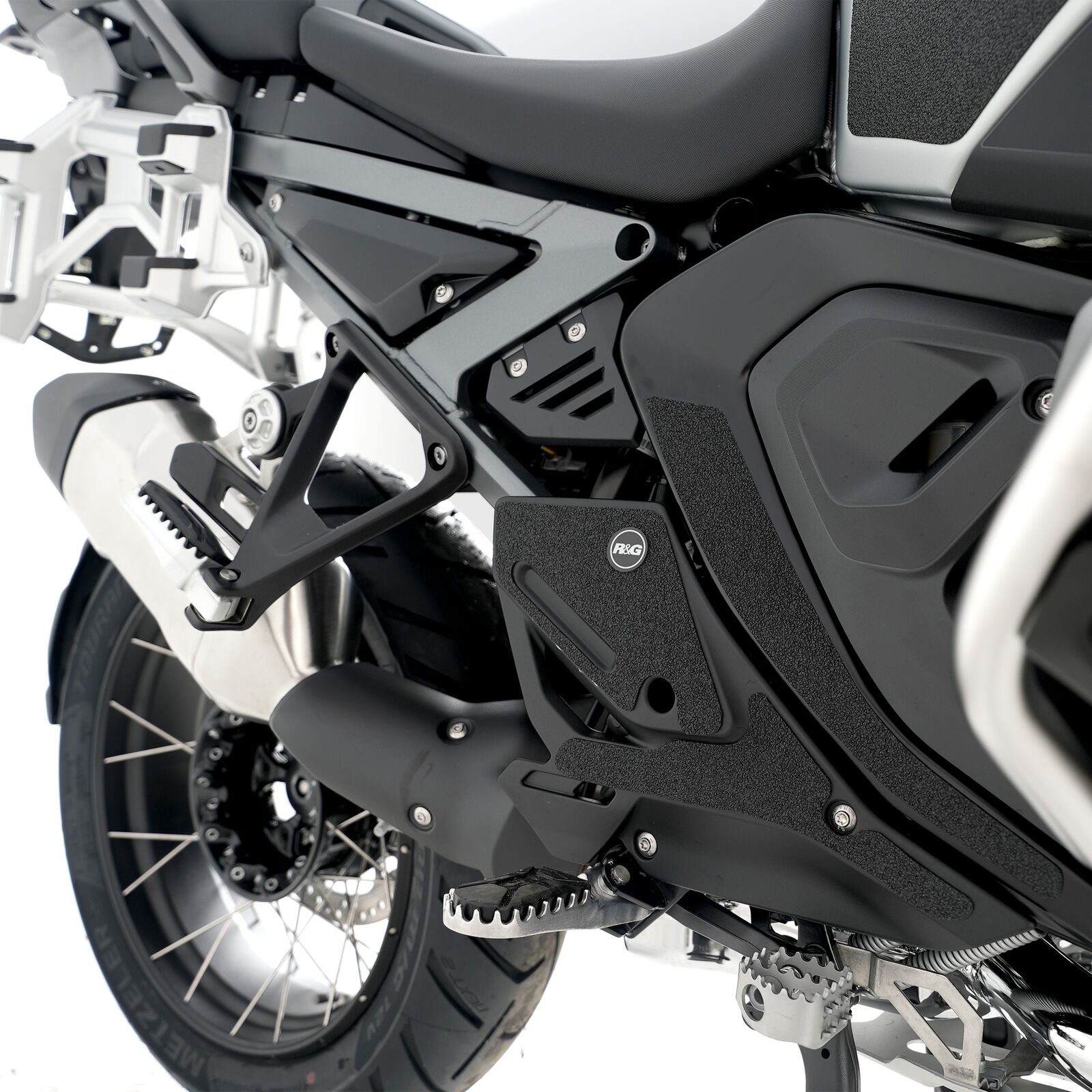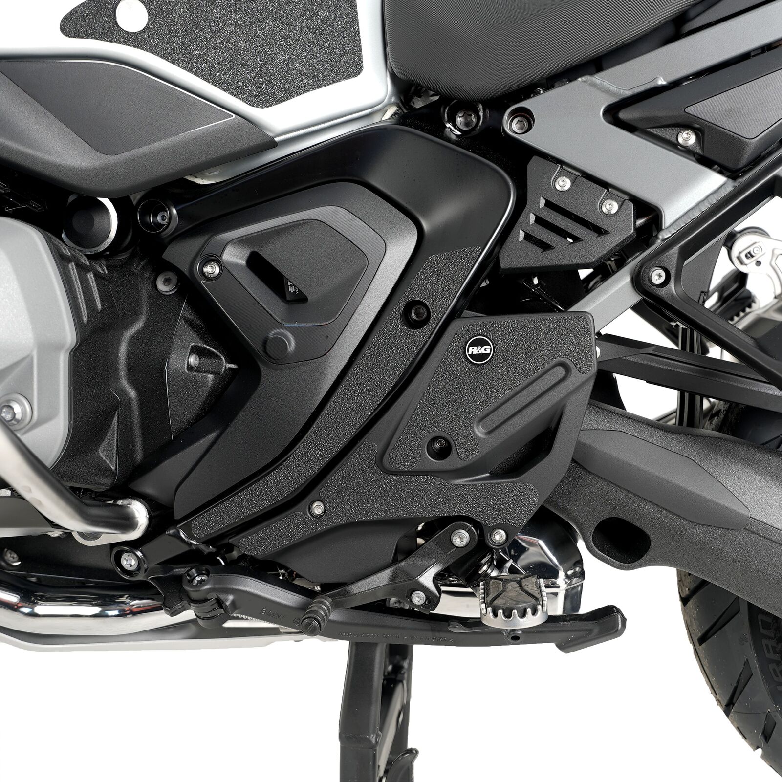 R&G Boot Guard kits are available for a large range of bike styles and brands, with new applications released regularly. The unique R&G texture was specifically designed to be durable, providing the rider with a buffer between his boot on the exposed areas of the swingarm which can (on occasion) come into contact with each other during cornering causing wear and unwanted damage to the swingarm or boots (both expensive to fix!). Each Boot Guard kit is supplied with precision pre-cut adhesive pieces, designed to fit the intended bike, typically in  2, 4 or 6 pieces depending on the shape of the swingarm. The high-strength adhesive backing ensures a highly durable product that will stay exactly where you put it, as well as not affecting or damaging paintwork. R&G Boot Guard kits are available in black or ultra-clear finishes to blend into your bike’s paintwork. Please note: R&G Boot Guards now come with a 25mm diameter stick-on emblem. This 6-piece Boot Guard kit has been specially designed for BMW R 1300 GS Adventure '24-.