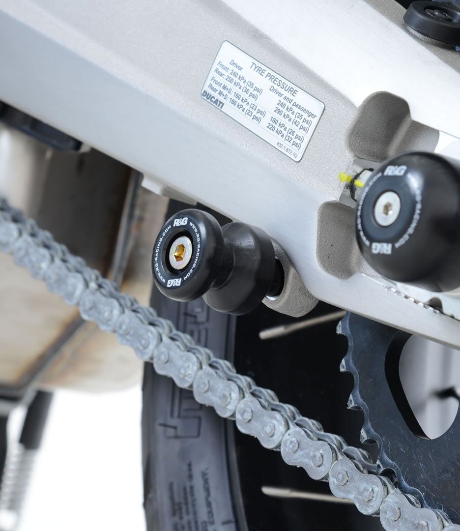 Are they cotton reels or spindle sliders? Well they are both really!! The Cotton Reel protects the swingarm and swingarm core components in the event of a crash or drop, but also double up as paddock stand bobbins. Allowing the motorcycles rear wheel to be lifted into the air via a paddock stand to performance chain adjustment, tyre changes and cleaning! This particular pair of R&G Cotton Reels are compatible with the Ducati Hypermotard 698 Mono'24-, Multistrada V2(S) '22- '24, Ducati Multistrada 1200 Enduro model '16 ,Multistrada 950 '17- '21/ 950S '19- '21 & Ducati Multistrada V4(S) '21- '24. Energica EGO/ EGO+/ EGO+RS '21-