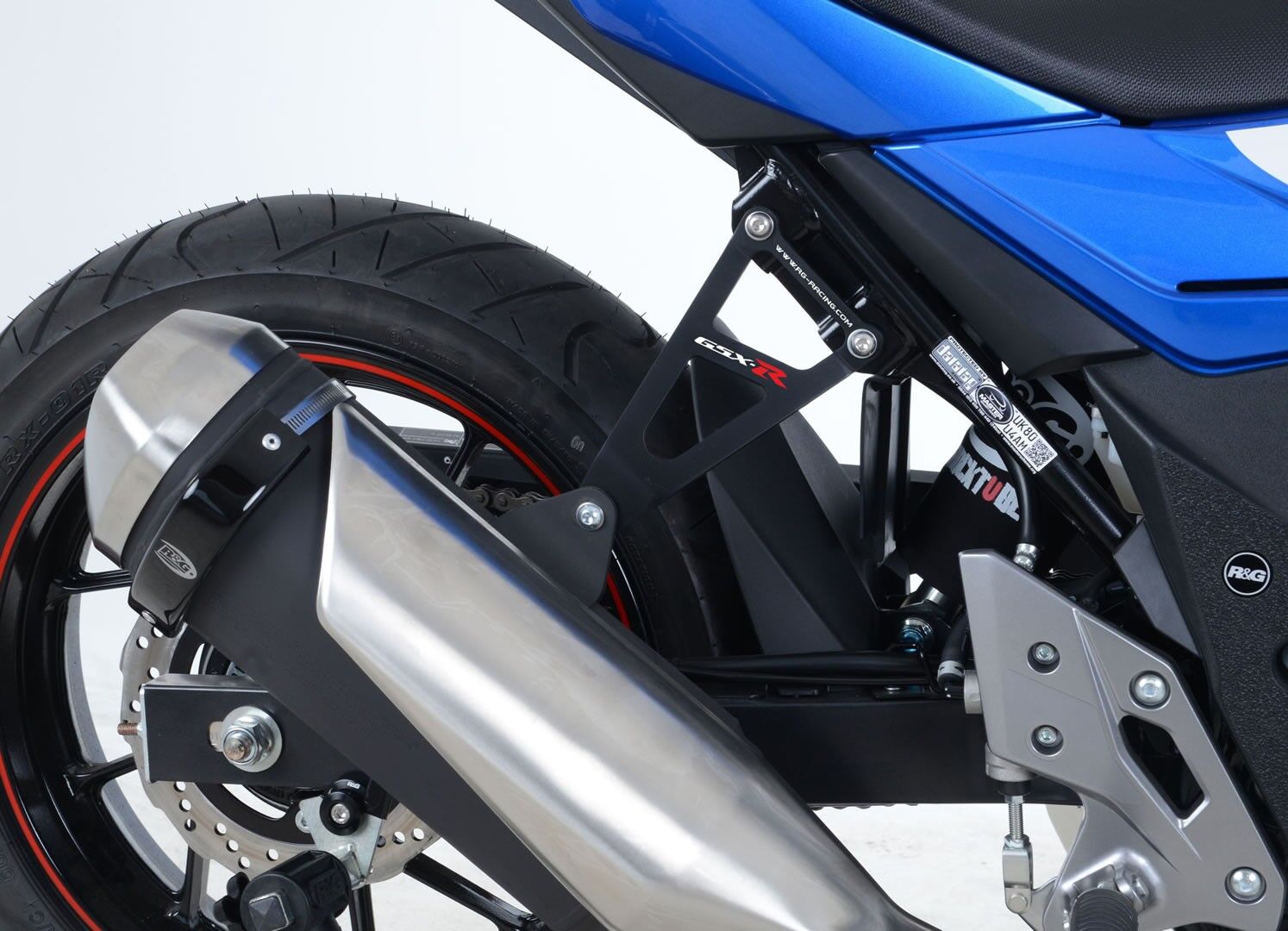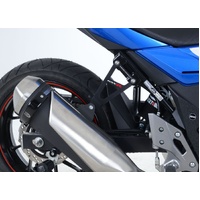 This stylish R&G Exhaust Hanger has been specifically designed for the Suzuki GSX250R '17-  models and not only reduces weight, but also gives the bike a sportier, sleeker look.  With a classy, black, powder coated finish and vivid GSXR graphics, it is made from sturdy, aircraft-grade aluminium and will retain its good looks for many years.