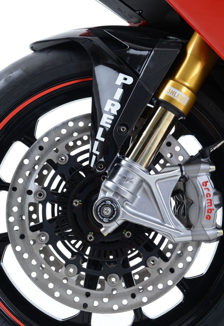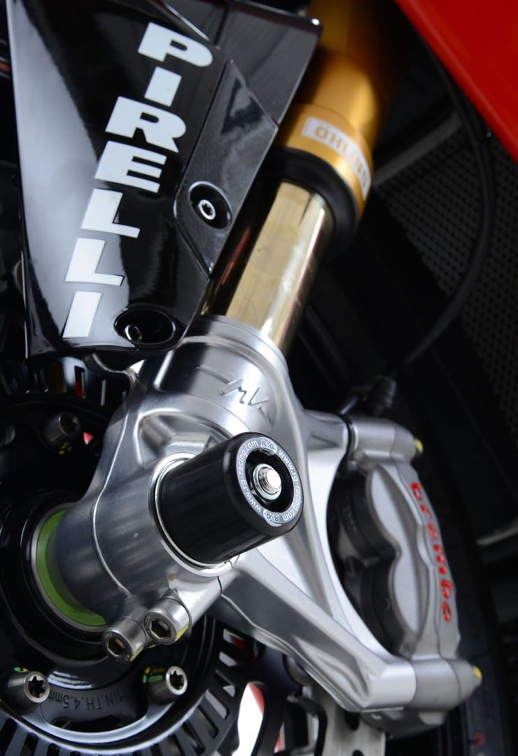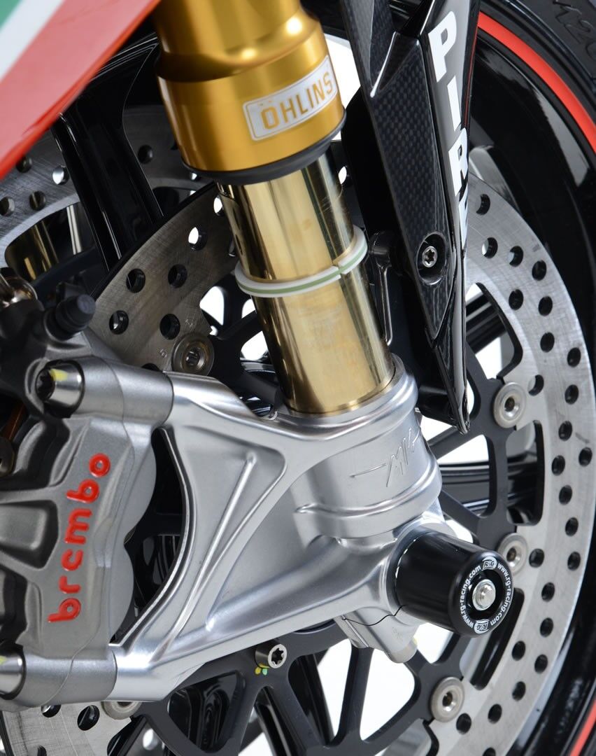 These fork protectors are suitable for the MV Agusta F4RC '15- models. Easy to install, they help to eliminate damage to the front forks, fork bottoms and brake calipers during a crash or drop.
