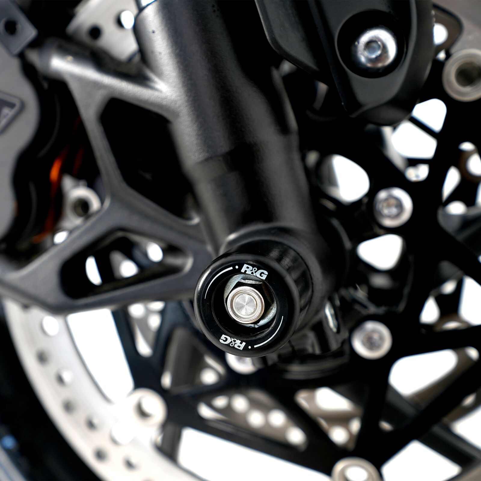 These fork protectors are suitable for the Triumph Street Triple R / RS 765 '17-, Street Triple S 765  '17-'20, Daytona 660 '24-, Trident 660 '21- & Daytona Moto2™ 765 '20- '24 models. Easy to install, they help to eliminate damage to the front forks, fork bottoms and brake callipers during a crash or drop.