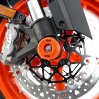 These fork protectors are suitable for the KTM 790 Duke '18-, 990 Duke 2024 /950 Superduke, SuperMoto '20-, 890 Duke R '20- '24 & CF Moto 800NK '23- models, helping to eliminate damage to the front forks during a drop.