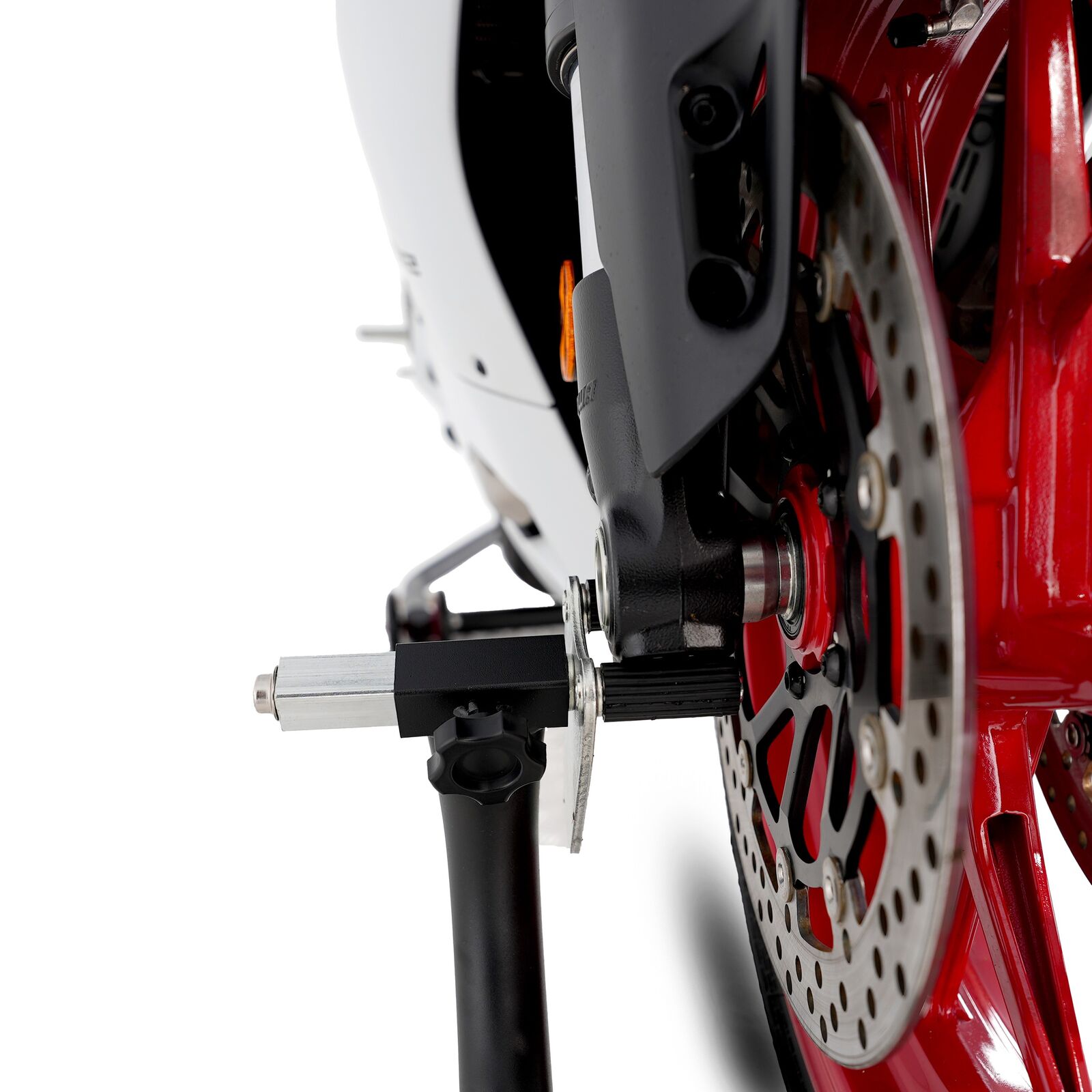 This model is a Front Paddock Stand and has specially designed adapters on the arms which hook and slot into the underside of the fork legs.