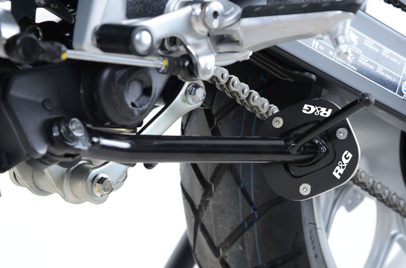 Kickstand Shoes bolt onto the bottom of the side-stand, to enlarge the original’s footprint by up to 100%, significantly spreading the load placed upon it, to help prevent the stand ‘piercing’ the ground. Despite this enlargement, the Shoe does not affect ground clearance or interfere with the chain run during normal riding.