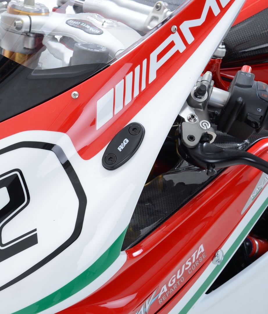 Lose your mirrors for that rebellious look or simply to stop your fairings flapping whilst on track days or racing! These neat blanking plates fit over the mounting point for the mirrors and can be fitted in seconds - (comes supplied with bolts for installation). This product is suitable for the MV AGUSTA F3 675(2012 onwards), F3 800 (2013 0nwards) and MV Agusta F4 '10- models. Sold as a pair.