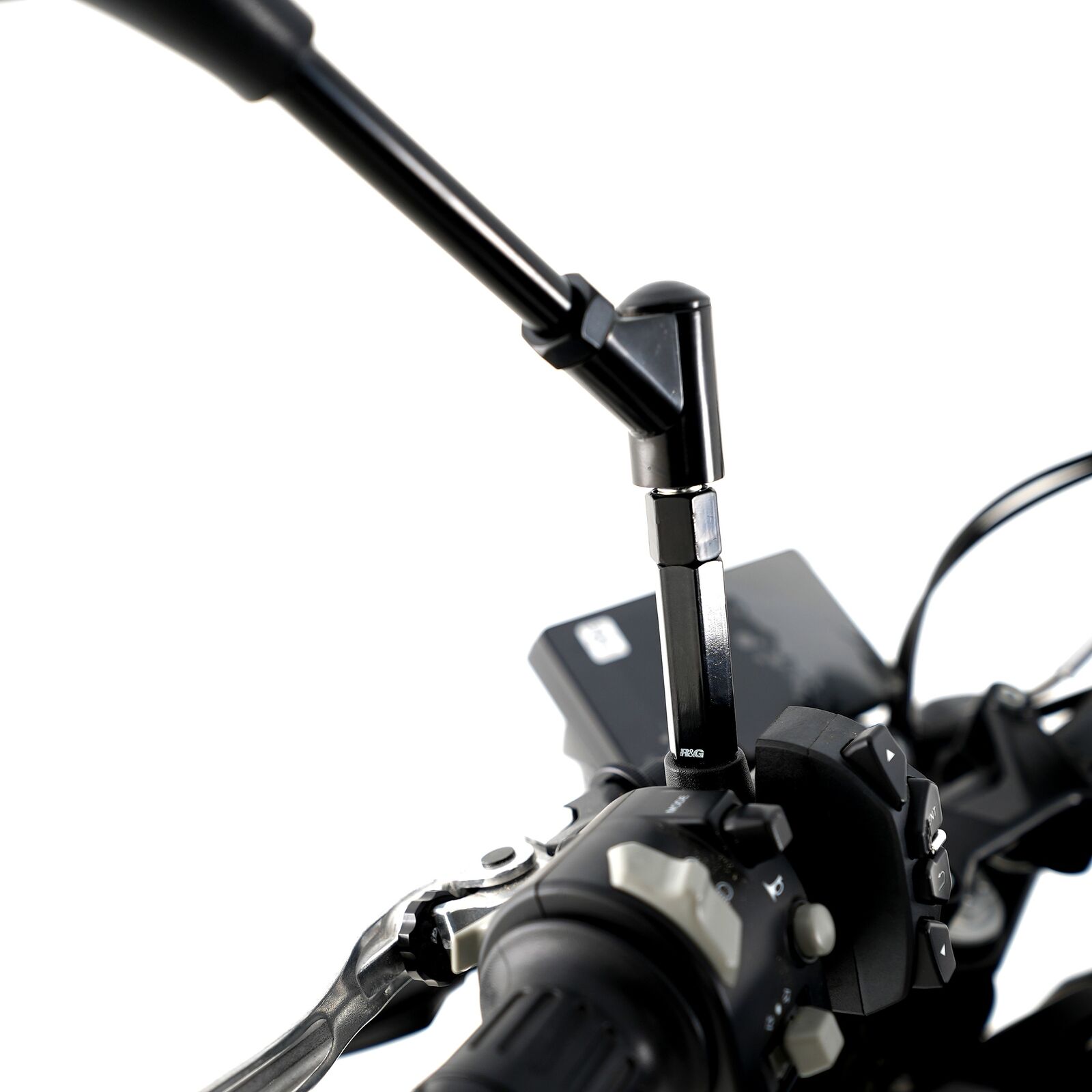 These Mirror Risers are made from 6082 T6 Aluminium and are suitable for any bike with an M10x1.25 (Right hand threaded) mirror socket. Suitable for the 990SMT/1290SuperDuke/Z1000 '14- '24/Speed Triple '11-'15/390Duke/NC750X/ Honda CB125R '18- '24 / Aprilia Shiver 900 '18- '24/ Honda CB650R '19- / Svartpilen 701 '19-  & Kawasaki ZH2 '20- '24 / Tiger 1200 GT pro '22- & Honda CMX1100 Rebel (DCT) '21- & CMX1100T Rebel (DCT) '23-, Triumph Tiger 900 Rally Pro &GT(Pro) '24- along with any bike with a M10x1.25 (right hand thread) mirror mounting points. Risers are perfect for increasing rearward visibility while riding.