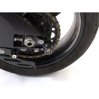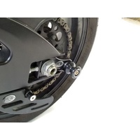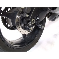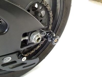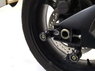 Are they cotton reels or spindle sliders? Well they are both really!! These new style offset cotton reels were designed to overcome the problem with the Suzuki GSX-R600 K8-L0 and GSX-R750 K8-L0 fitted with the standard exhaust/can as our traditional style cotton reels may foul the exhaust under extreme suspension travel conditions (see CR0001BK which can still be fitted for these bikes if the standard exhaust/can is replaced). The Cotton Reel is mounted to a special, black-anodised aluminium bracket (included with the kit), bringing the Cotton Reel away from the exhaust silencer. The product will give protection to the swingarm area in most crashes. Also the bike can be lifted on the Cotton Reels, using a paddock stand with hooks (suggest R&G code SH0001). For rear wheel removal, you can take the Cotton Reels out of the aluminium blocks and insert them into the paddock stand bobbin screw holes.