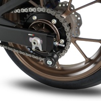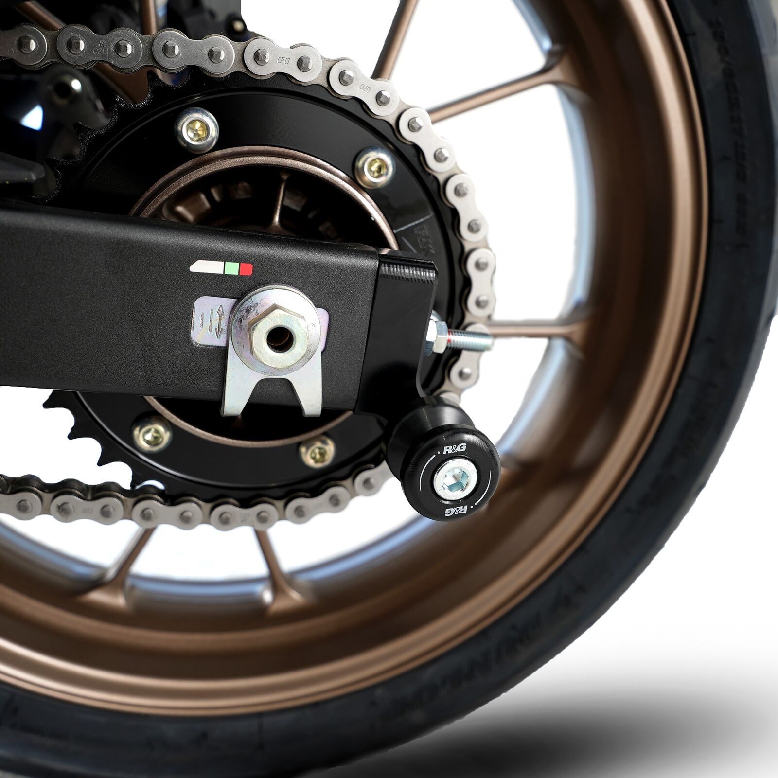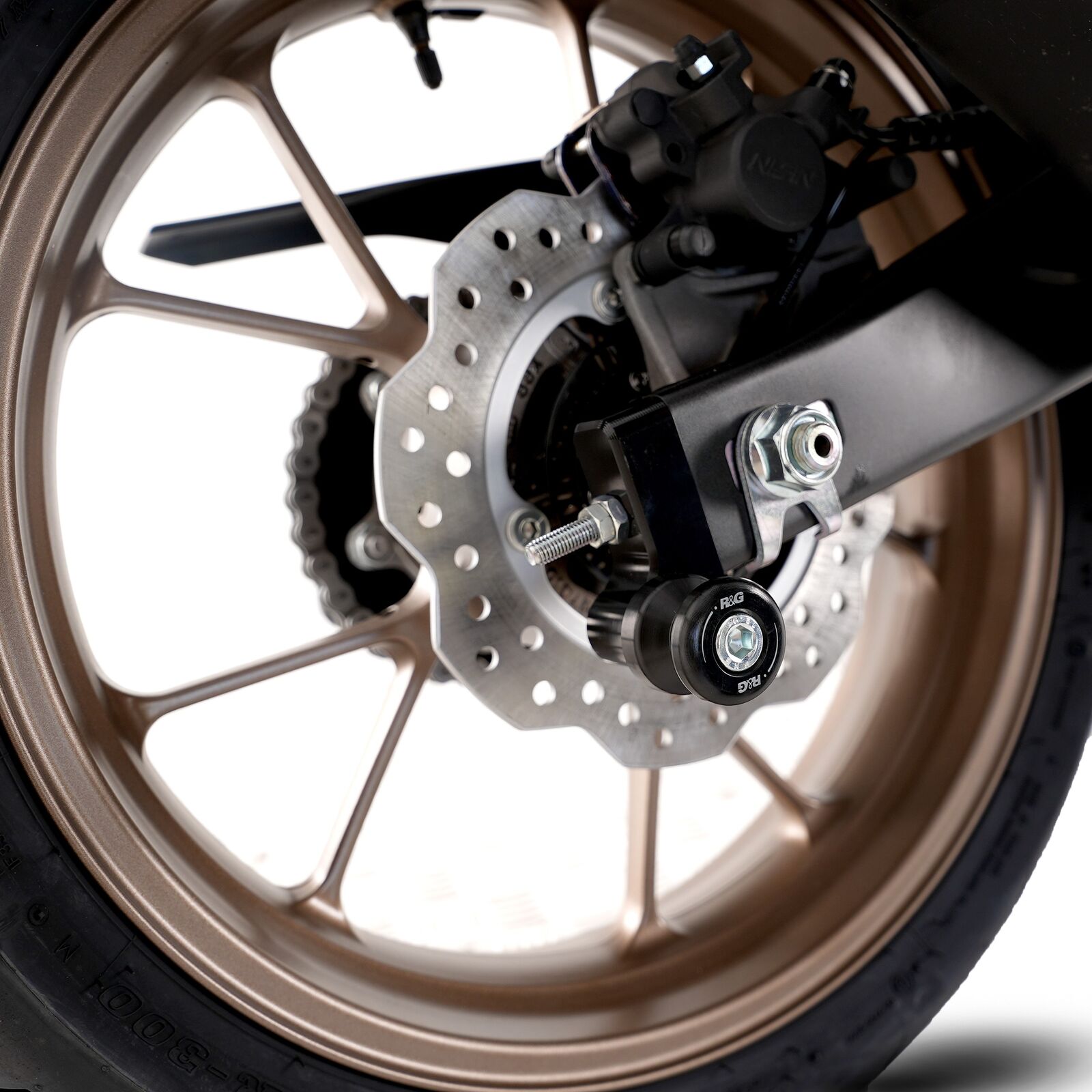 Suitable for the Suitable for the Honda CB125R '18- '24 & CB300R '18- '24  models. Are they cotton reels or spindle sliders? Well they are both really!! The Cotton Reel is mounted to a special, Stainless steel bracket. The product will give protection to the swingarm area in most crashes. Also the bike can be lifted on the Cotton Reels, using a paddock stand with hooks (suggest R&G code SH0001).