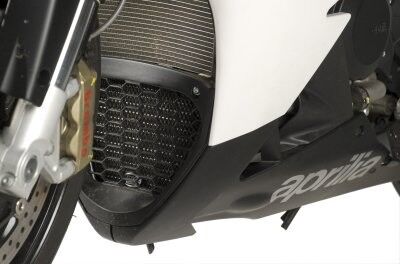 This oil cooler guard is suitable for the Aprilia V4 Tuono, Aprilia RSV4-R and Aprilia RSV4 Factory and can be placed behind the existing plastic fairing piece or replace it entirely (as seen in pictures 1 and 2).
