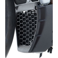 R&G Oil Cooler Guards are available in a black finish. They are made from pressed aluminium and feature a neat, seamless frame. They improve the looks of your bike and help to protect your expensive and vulnerable oil cooler from flying debris.