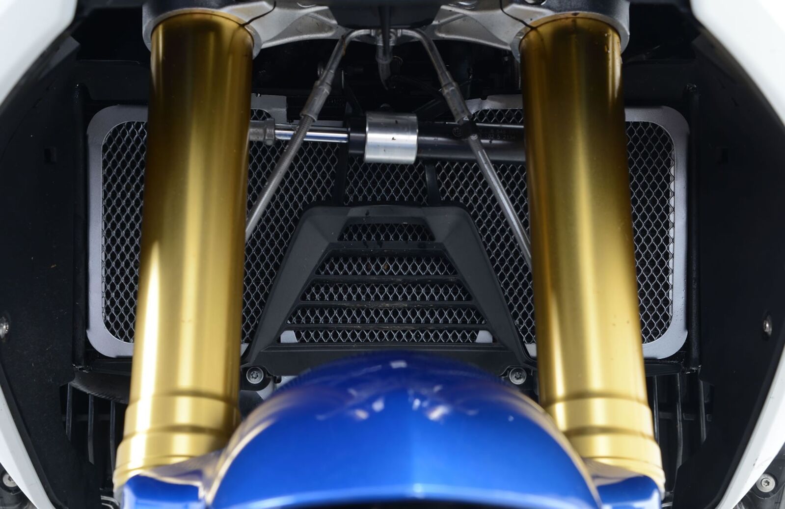 This R&G radiator guard has been designed to perfectly fits the BMW R1200R/RS '15-'18 R1250R (RS) '19-, R1250RS SE '24- models, available in Black, Blue, or Titanium powder coat finishes.