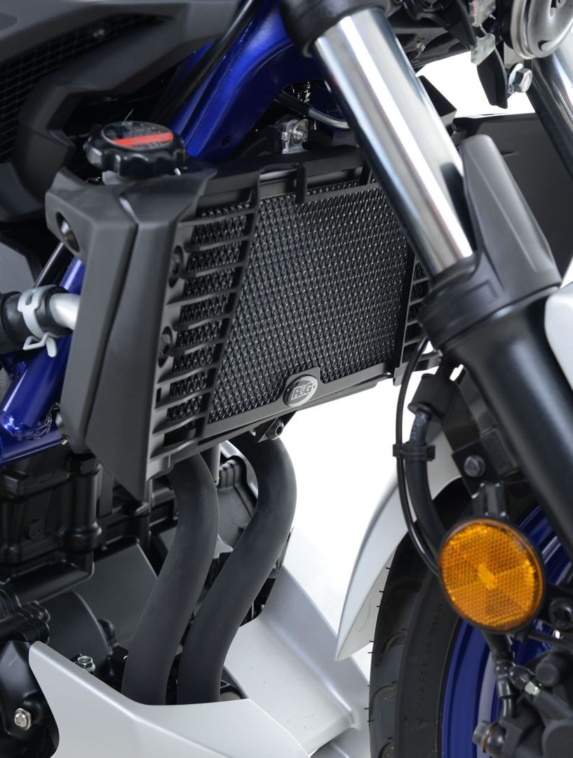 Available in black, dark blue and red powder coat finishes to fit the Yamaha YZF-R25 '14- and YZF-R3 '15- '24 and the MT-25 and Yamaha MT-03 '16- models. Made from pressed aluminium and feature a neat, seamless frame (where applicable).  They improve the looks of your bike and help to protect your expensive and vulnerable radiator from flying debris.