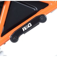 Suitable for the KTM RC 125/200/390 '14-'16. These blanking plates simply screws in, covering those otherwise exposed subframe holes left once the rear footrests have been removed keeping them free from of dirt buildup. Finished in Black with white R&G Racing logo.