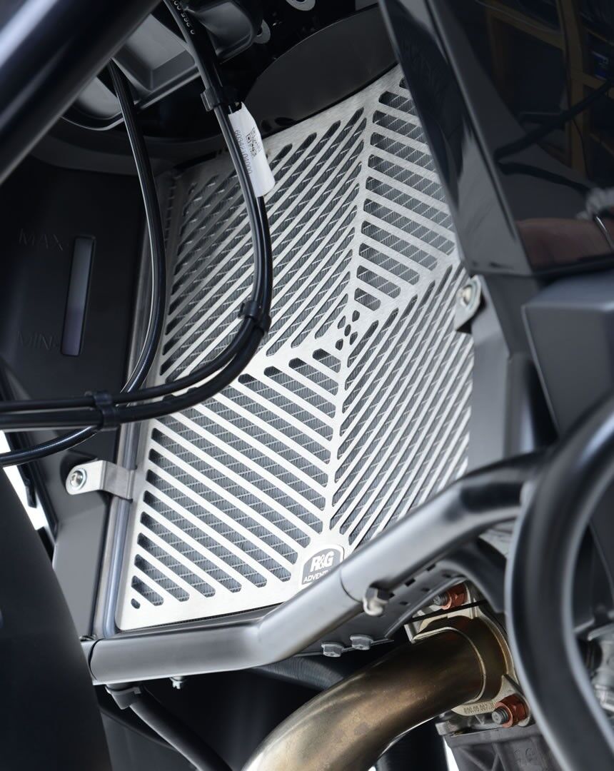 The R&G Stainless Steel Radiator Guard series is a more rugged version of our existing aluminium offering and are aimed particularly for Adventure bikes. Constructed from 1mm stainless steel sheet allows the guard to be incredibly strong and impervious to rust – perfect for bikes and riders who may tackle demanding terrains and conditions. The laser-cut grills are designed for maximum airflow to the radiator so that cooling isn't compromised; the Radiator Guard is as good looking as it is purposeful. The CNC finished guard attaches easily and quickly to the front of the radiator, either by utilizing the existing mounting bolts or cable tied on. No modifications need to be made to the bike to install. This model is suitable for the KTM 1050 Adventure '15-, KTM 1090 Adventure '17-, KTM 1190 Adventure '13- and the 1290 Super Adventure '15-'20. (Picture is for illustration purposes only)