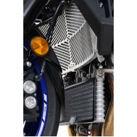 The R&G Stainless Steel Radiator Guard series is a more rugged version of our existing aluminium offering and are aimed particularly for Adventure and Touring bikes. Constructed from 1mm stainless steel sheet allows the guard to be incredibly strong and impervious to rust – perfect for bikes and riders who may tackle demanding terrains and conditions. The laser-cut grills are designed for maximum airflow to the radiator so that cooling isn't compromised; the Radiator Guard is as good looking as it is purposeful. The CNC finished guard attaches easily and quickly to the front of the radiator, either by utilizing the existing mounting bolts or cable tied on. No modifications need to be made to the bike to install this radiator guard. This particular guard protects the Radiator of the Yamaha YZF-R1 '15-  and Yamaha MT-10 (FZ-10) '16- & SP '17- models. Please note: Lower Oil Cooler Guard IS NOT included with this kit, but is available seperately.