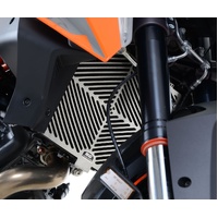 New for 2013. The R&G Stainless Steel Radiator Guard series is a more rugged version of our existing aluminium offering and are aimed particularly for Adventure and Touring bikes. Constructed from 1mm stainless steel sheet allows the guard to be incredibly strong and impervious to rust – perfect for bikes and riders who may tackle demanding terrains and conditions. The laser-cut grills are designed for maximum airflow to the radiator so that cooling isn't compromised; the Radiator Guard is as good looking as it is purposeful. The CNC finished guard attaches easily and quickly to the front of the radiator, either by utilizing the existing mounting bolts or cable tied on. No modifications need to be made to the bike to install. This model protects the Radiator of the KTM 1290 Super Duke R '14 -'19 / GT Models.