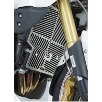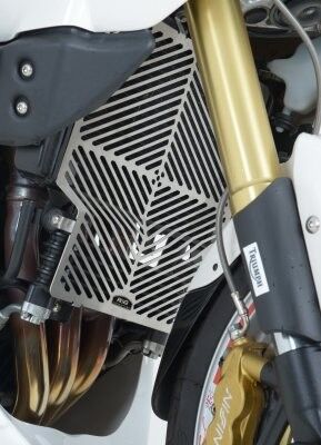 New for 2013. The R&G Stainless Steel Radiator Guard series is a more rugged version of our existing aluminium offering and are aimed particularly for Adventure bikes. Constructed from 1mm stainless steel sheet allows the guard to be incredibly strong and impervious to rust – perfect for bikes and riders who may tackle demanding terrains and conditions. The laser-cut grills are designed for maximum airflow to the radiator so that cooling isn't compromised; the Radiator Guard is as good looking as it is purposeful. The CNC finished guard attaches easily and quickly to the front of the radiator, either by utilizing the existing mounting bolts or cable tied on. No modifications need to be made to the bike to install. This model is suitable for the Triumph Tiger 1050 and Tiger 1050 Sport onwards.