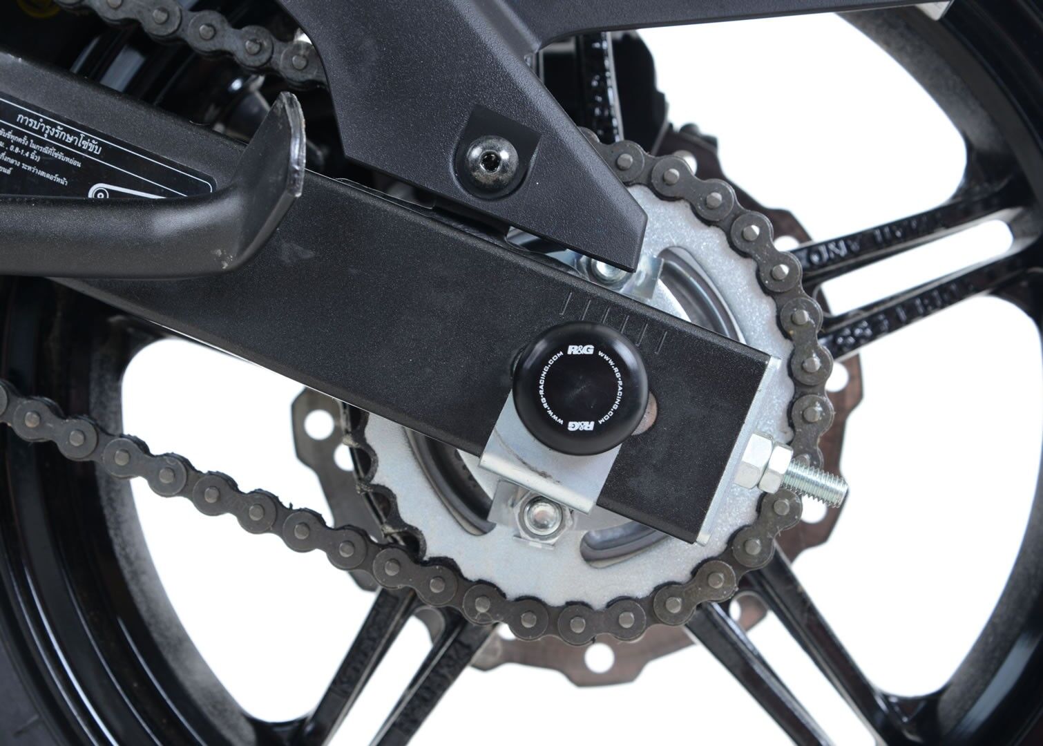 These swingarm protectors, for the Kawasaki Z125 / Z125 Pro '16- models attaching to either end of the rear wheel spindle.